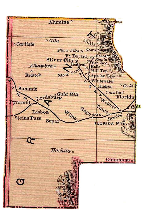These edited county maps are based on the 1895 State of New Mexico map by Global Landforms DataBase and used with their permission. Edited by C. W. Barnum size = 89KB